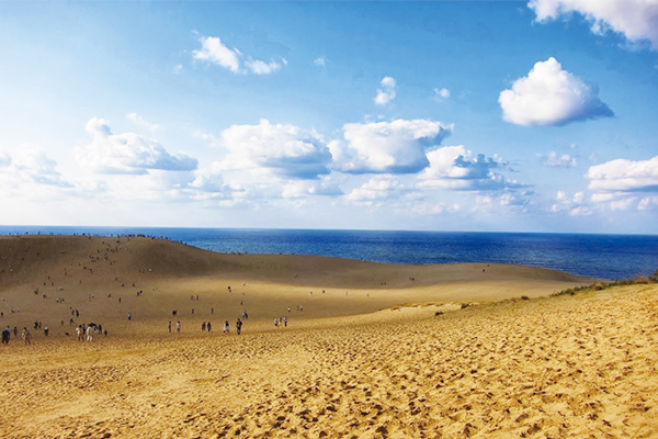 【日本最大沙漠地~鳥取砂丘】東西16公里,南北2公里,高低落差達92公尺的鳥取砂丘、是經歷了數萬年時間所創造出大自然傑作,也是日本境內最大的砂丘,滾滾的黃砂會讓人有置身於沙漠中的錯覺。天晴時,海風會在廣大的砂丘上割出一條條美麗的波紋,而大雨過後,當逐漸乾燥的沙從斜坡宣洩而下時,則會形成像簾幕一般的黃沙瀑布,這種被稱作「風紋」和「沙簾」的沙漠特有景觀、都能在鳥取砂丘中見到,壯觀的景象讓人嘆為觀止!