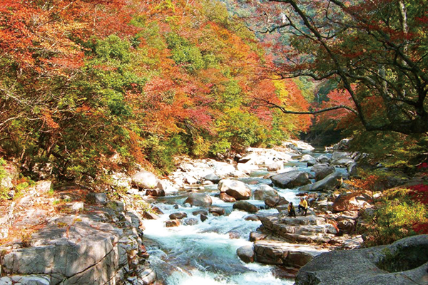 【紅葉名所〜奧津溪】位於奥津溫泉下游3公里的溪谷。河床的石頭因水流帶動而打轉,經歷長時間磨穿岩石而形成的圓孔「壺穴」,號稱東洋第一。長約800公尺的步道,能夠享受散步的樂趣。尤其是每年11上旬~中旬左右的美麗楓紅,染上紅色或橘色的葉子不僅倒映在溪谷的水面,更暈染整片溪谷。