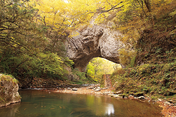 【國家天然紀念物~雄橋】雄橋是石灰岩因長年溪水的浸蝕而形成的天然橋,全長90公尺,寬18公尺,厚度有24公尺,若從河川底下算起,足足有40公尺高,相當於16層樓。它是大自然賜予的日本國的象征,被日本國民稱作上天賜予的禮物(神橋),也是日本國唯一的天然橋,是最值得驕傲的自然景觀之一。