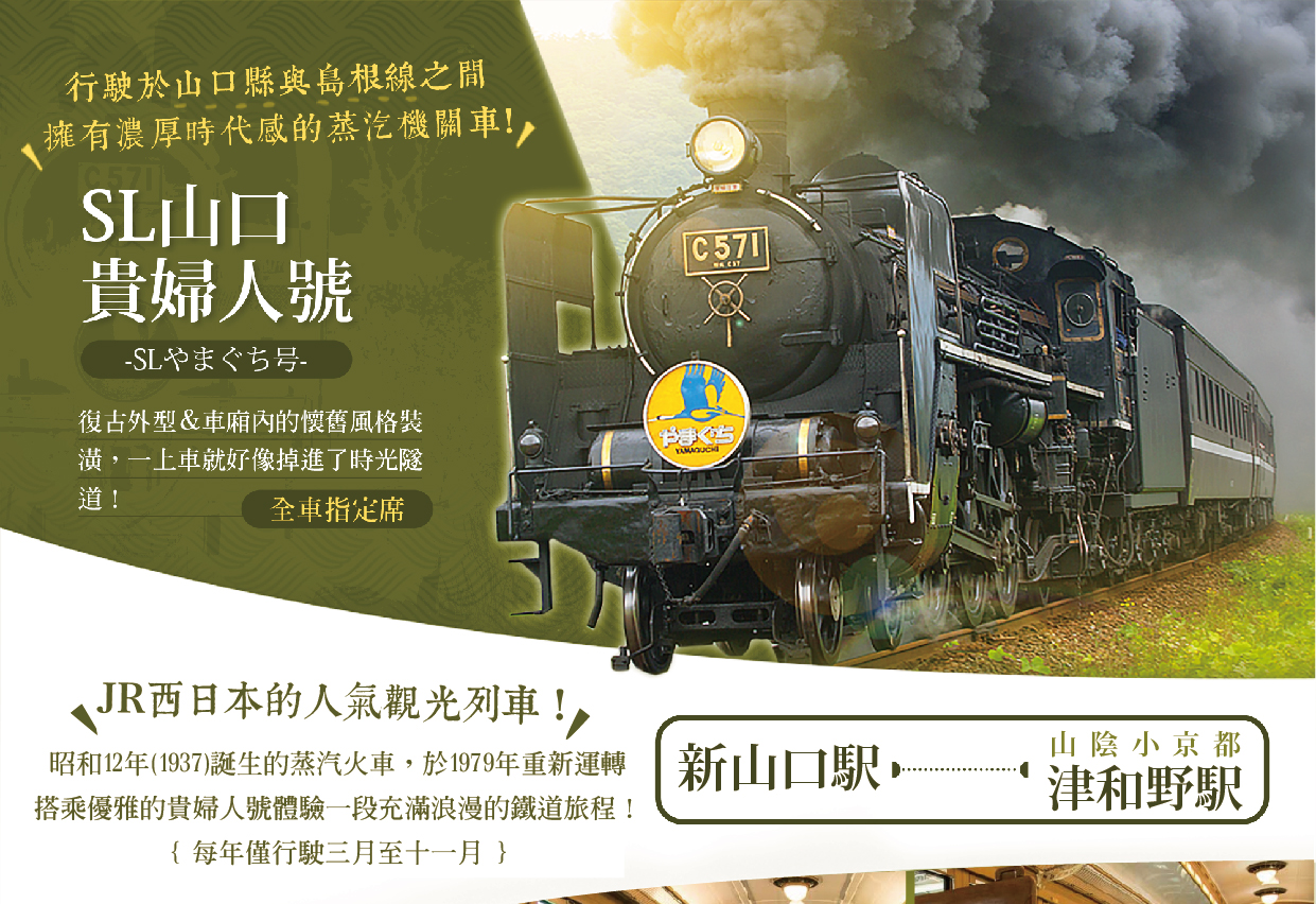 【體驗蒸汽火車~津和野鐵道-貴夫人號】在1979年復活於山口線的蒸氣火車。以「貴婦人」的暱稱廣為人知的「C57型1號機」及「C56型」等SL蒸氣火車,五節車廂有簡潔的「大政風」、高貴的「明治風」、和風的「昭和風」、艷麗的「歐風」及具景觀功能的「展望車廂」,花2小時來連結了新山口及山陰的小京都-津和野之間。搭乘洋溢復古情懷的車廂,彷彿回到日本大正、昭和年代。