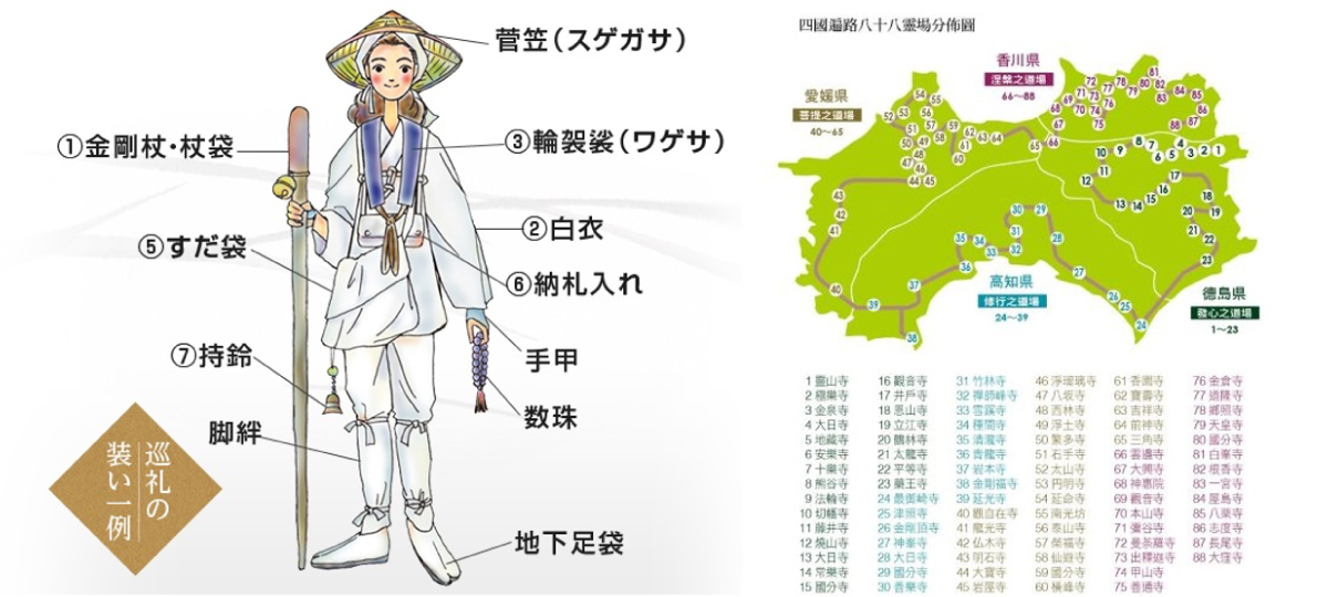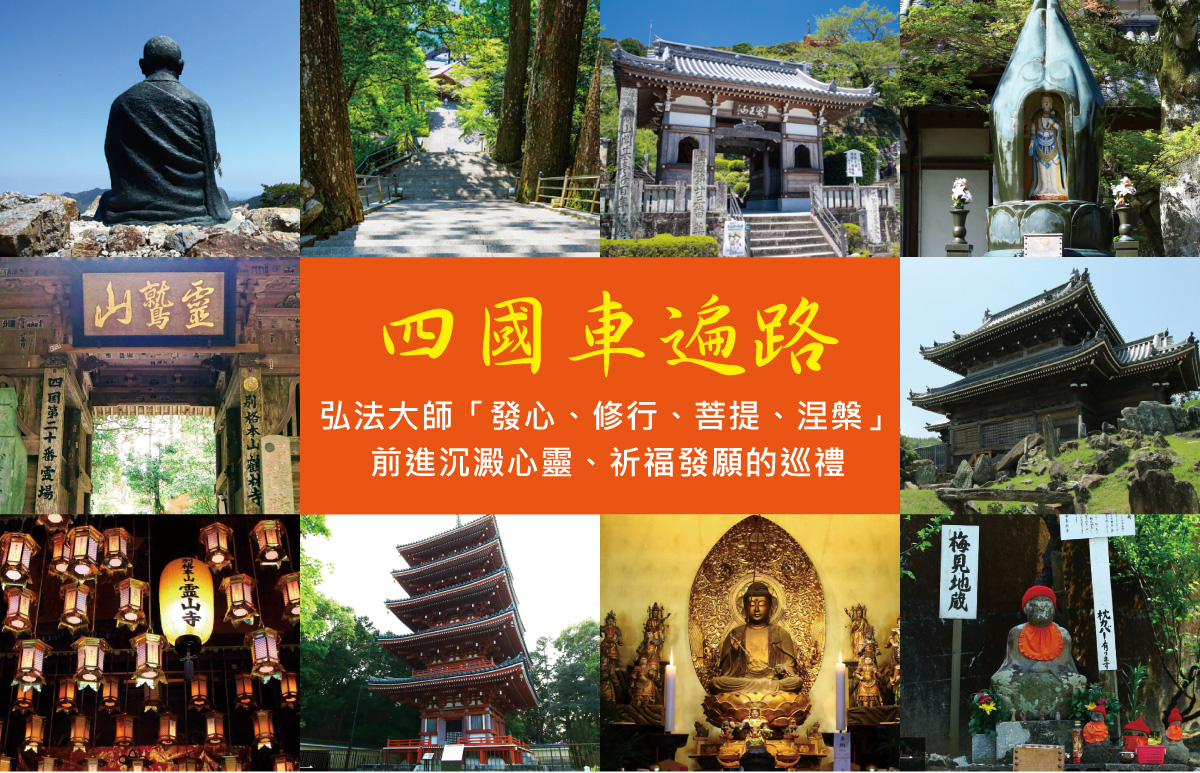 日本真言宗開山僧者——遍照金剛弘法大師(空海)有關的寺院場所,從第一座靈山寺至第八十八座大窪寺,沿途代表了「發心、修行、菩提、涅槃」四個階段。從心重新檢視自己的道路出發,尋求悟道與心靈的昇華,遍路是為沈澱心靈、祈福發願的巡禮。四國 88 寺朝聖之旅傳統稱呼為「遍路」,指的是巡訪約 1,200 年前,空海曾經修行過的八十八座四國靈場的路線。空海諡號「弘法大師」,是真言宗的開宗祖師,並於佛教聖地高野山建立了真言宗總本山寺院「金剛峯寺」。