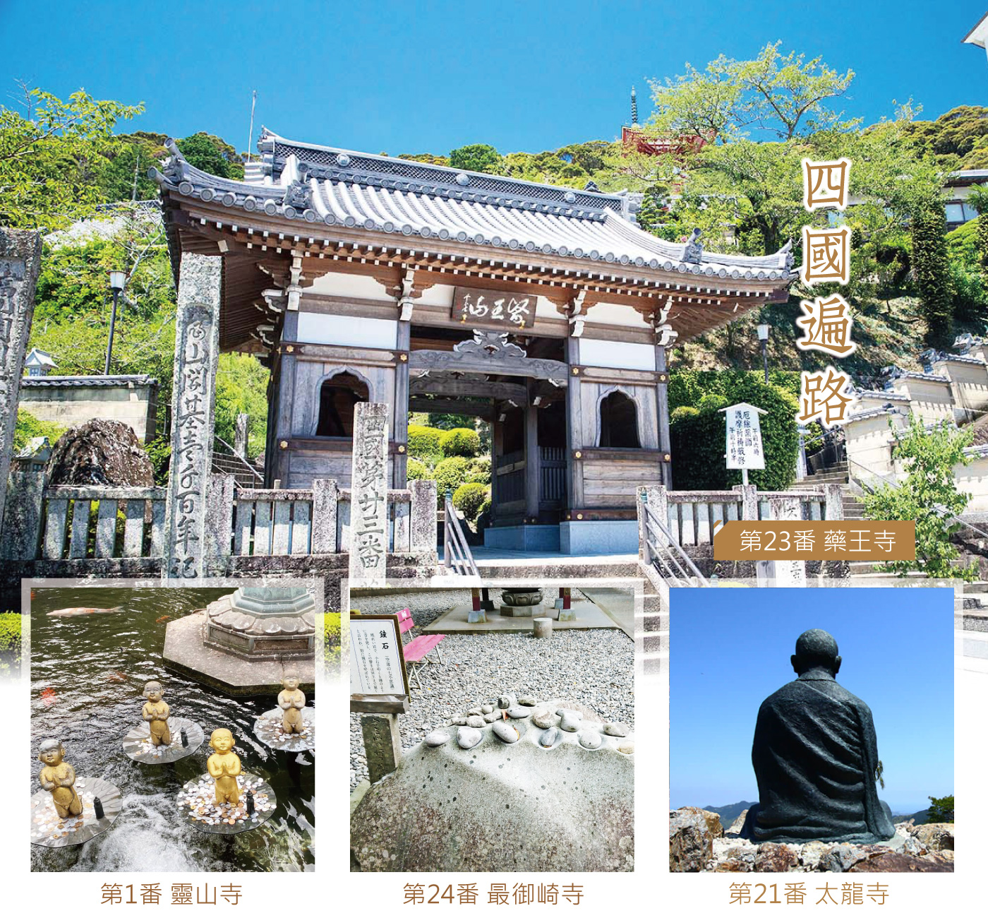【一番〜靈山寺】是真言宗的始創人弘法大師四國朝經88所的第一座經殿,供奉的是釋迦如來,重要文化財產藥師三尊像和十一面觀音像等的貴重文物,是弘法大師發願遍路的起點。仿釋迦牟尼佛在印度靈鷲山講授佛法,為此寺命名靈山。