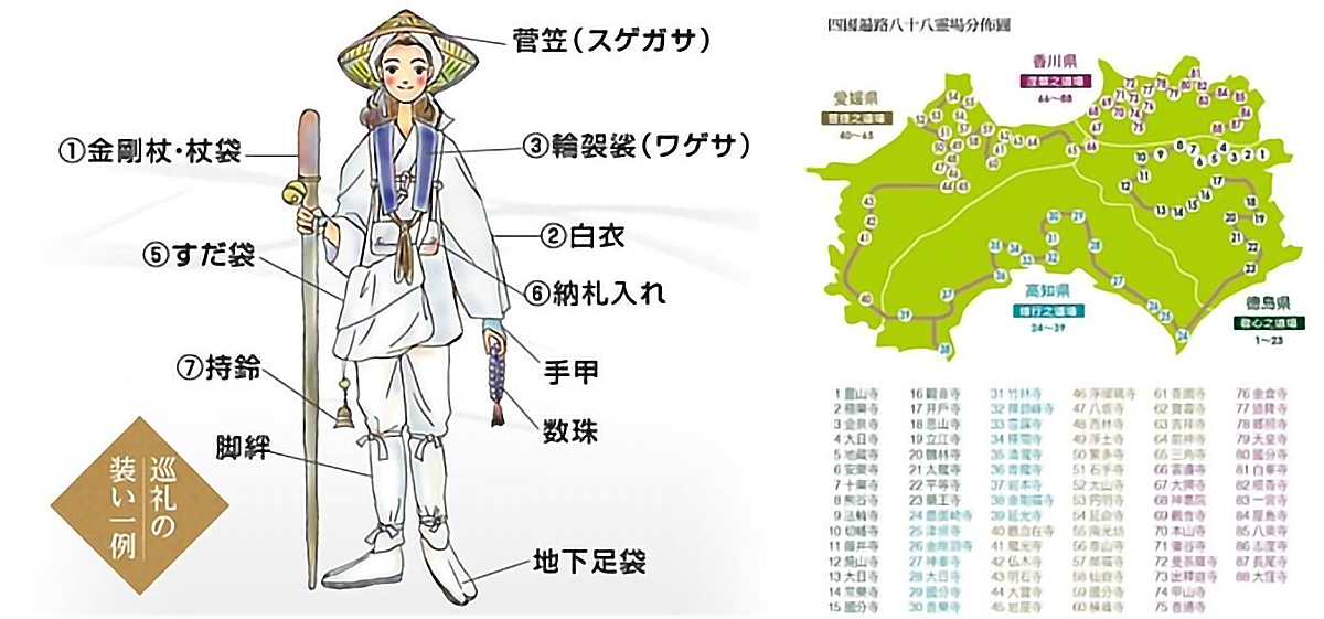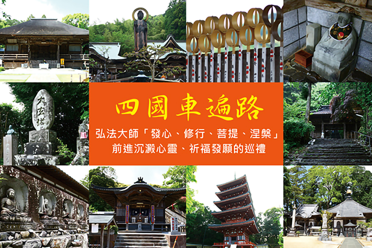 日本真言宗開山僧者- - 遍照 金剛弘法大師(空海)有關的寺院場所,從第一座靈山寺至第八十八座大窪寺,沿途代表了「發心、修行、菩提、涅槃」四個階段。從心重新檢視自己的道路出發,尋求悟道與心靈的昇華,遍路是為沈澱心靈、祈福發願的巡禮。四國88寺朝聖之旅傳統稱呼為「遍路」,指的是巡訪約1,200年前,空海曾經修行過的八十八座四國靈場的路線。空海諡號「弘法大師」,是真言宗的開宗祖師,並於佛教聖地高野山建立了真言宗總本山寺院「金剛峯寺」。