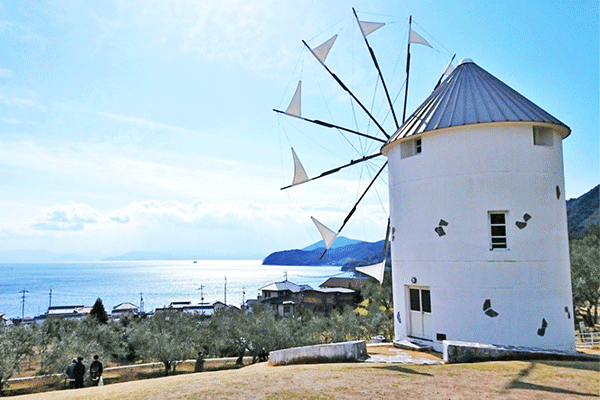 【小豆島橄欖公園】因氣侯乾燥少雨,類似地中海沿岸的國家是日本最早引進橄欖種植的地區,而「橄欖」也變成是小豆島的特產之一,在公園內的橄欖紀念館展出各種特製的產品從實用的橄欖油到養顏美容的保養品在這裡通通都有;走出戶外佇立在山坡上可以清楚眺望瀨戶內海天藍色的海平面而旁邊希臘風車隨著微風轉啊轉優閒寧靜的感受讓人彷彿置身在愛琴海般是多麼的愉快!!