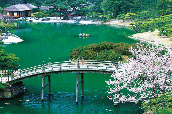 【栗林公園】四國最著名的庭園,於1625年由當時代代讚岐藩(香川縣舊名)藩主苦心經營,歷經百年打磨潤飾而完成的傳統庭園在面積75公頃的公園裡共有6個湖泊和13個假山以阪10多個亭閣,是江戶時代最著名的『迴遊式大名庭』,以翠綠的紫雲山為背景,建造了小橋、流水、涼亭、松林錯落有致,在春天繁花似錦、夏天蓮花亭亭、秋攻楓紅成片、冬天銀雪遍佈,天然景致和後天的人工栽培融為一體更顯得立體有深度,而這屬於江戶時代的大名(藩主)庭園雖經過二次大戰仍完整地保留下來,現在更是被指定為日本國家的特殊名勝更是高松人最為自豪的珍珠。